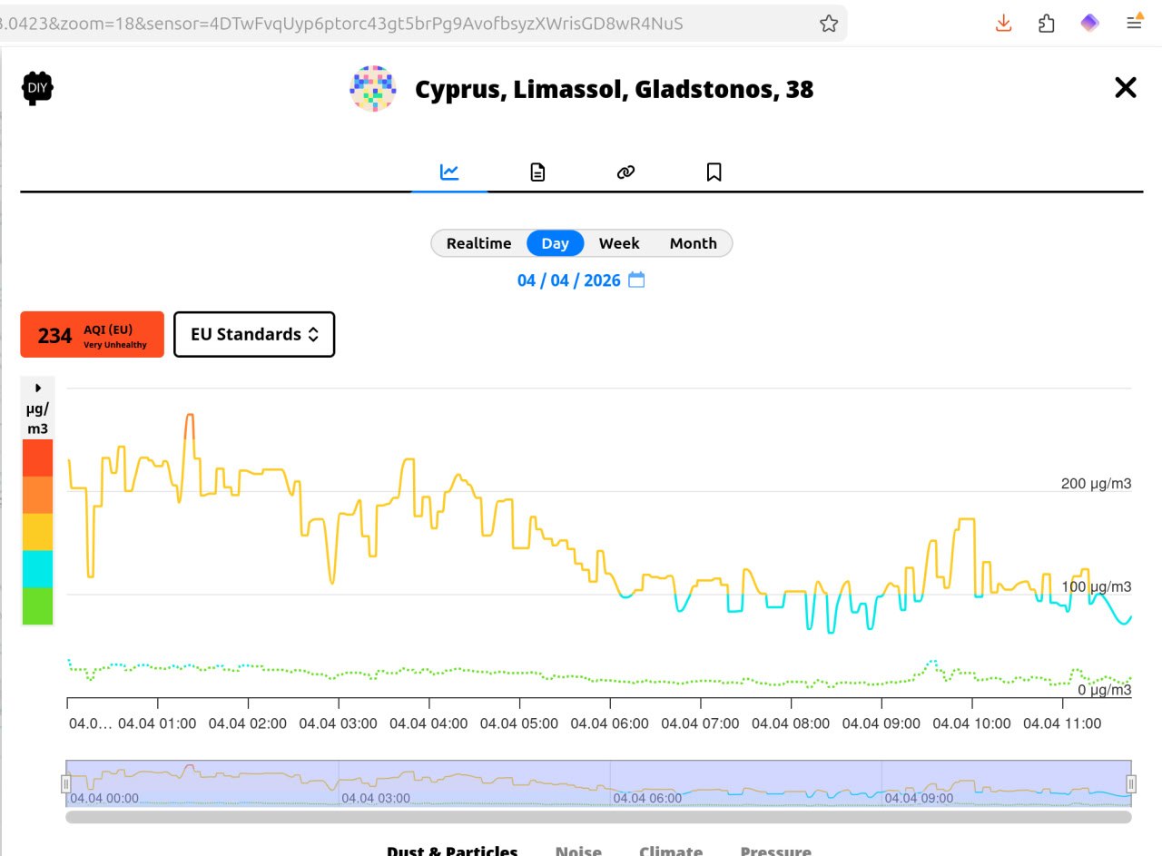 И очень рекомендую изучать саму карту с независимыми датчиками, так как ещё и получите инсайты для образования личного о том, как выглядят пылевые бури на графиках в цифрах! 🤓 https://sensors.social/?type=pm10&date=2026-04-03&provider=remote&lat=34.86&lng=33.7335&zoom=9