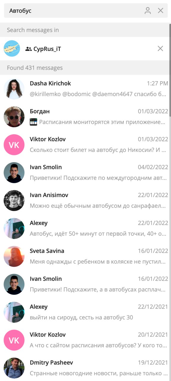 @dkirichok@kirillemko @bodomic @daemon4647 спасибо большое, может быть подскажете, каким приложением можно смотреть как добираться от точки до точки по Лимассолу на автобусе? или никаким? гугл мапс вообще не показывает общественный транспорт. знаю, что автобус 30 ходит по берегу и пока все. Если вопрос не по адресу, извините, напишу в общий чат