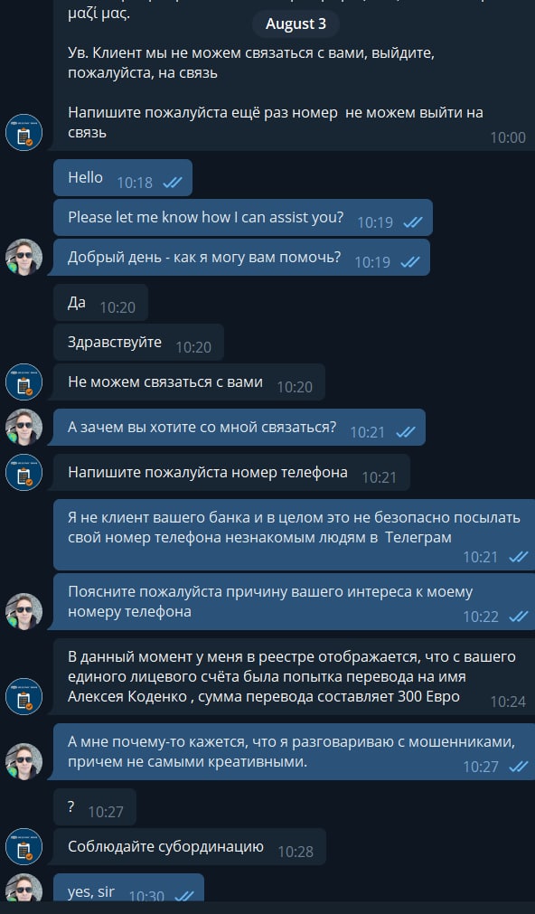 кипрский банк? пишет сам? в телеграм??? что может пойти не так? ))))