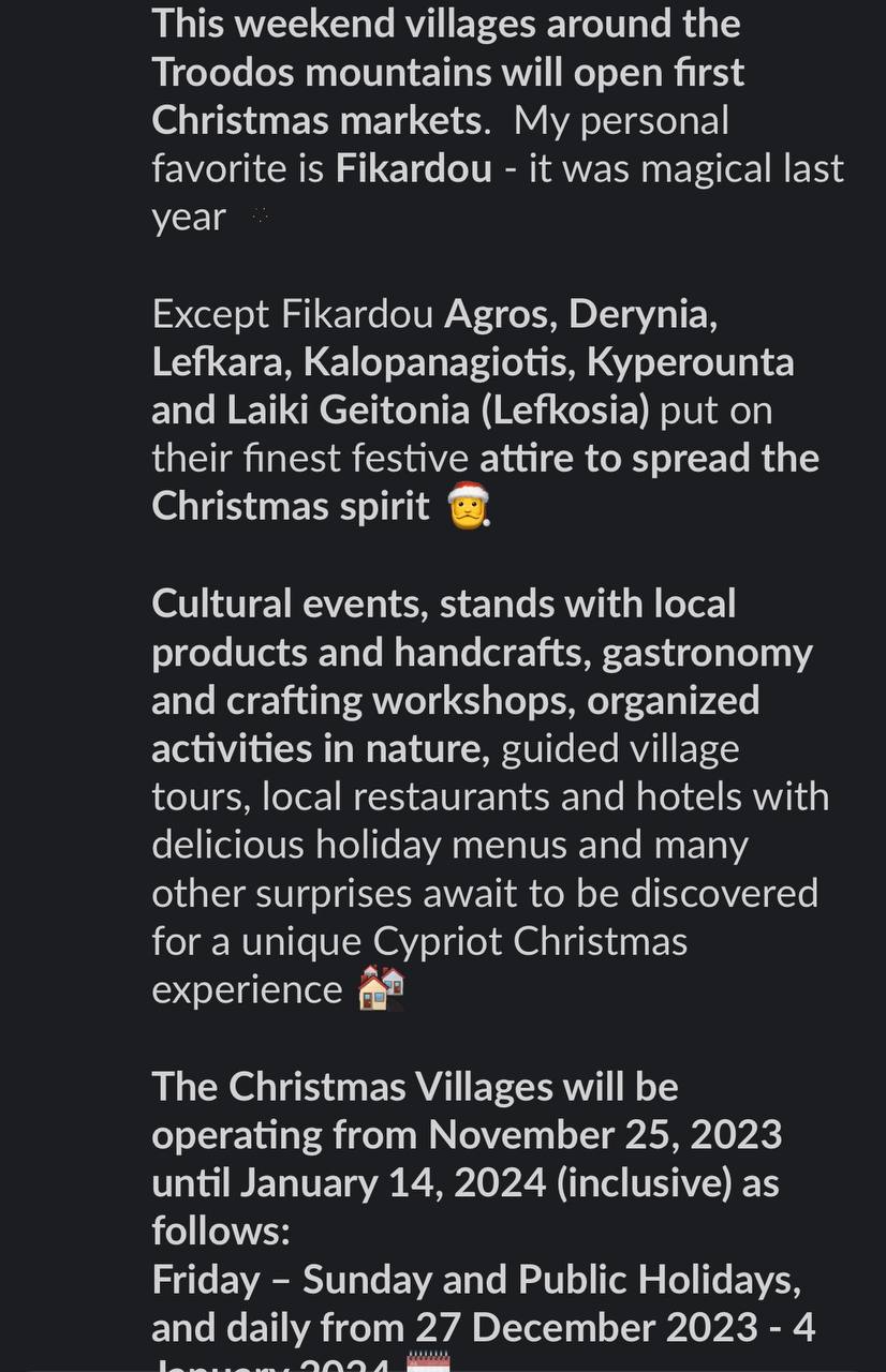 Я был вчера в Калопанайотис. Очень гостеприимно, но масштаб действа, конечно, небольшой. Поэтому надо что-то ещё включать в программу: местный уникальный монастырь, пару церквей, венецианские мосты, обед или ужин в таверне и прочее из тех тем, что Вам интересны. Есть смысл куда-то вечером приехать - будет роментичнее, но надо уточнять часы работы. Оплату в киосках с рождественскими товарами принимают наличными, но кое-где и через Revolut. И ннавигатор с приложение о достопримечательностях Кипра зараннее установите. Порекомендовать?