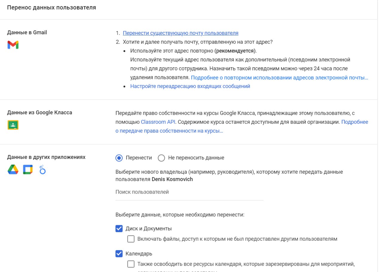 Когда удаляешь учетку гугл спрашивает куда дубликат календаря, почты и документов и т.д.