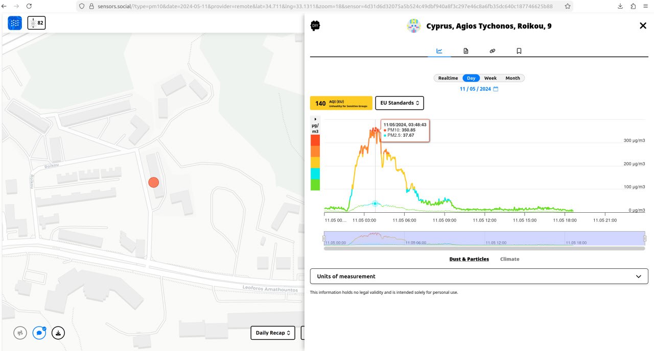 Так как это IT chat думаю будем многим интересно понаблюдать за природным явлением под носом через open source сенсорную сеть, что мы тут раскинули командой 2 года назад 🤓 и публикуем открыто данные от независимых участников с их балконов: https://sensors.social/?type=pm10&date=2026-02-02&provider=remote&lat=34.7961&lng=32.9153&zoom=11