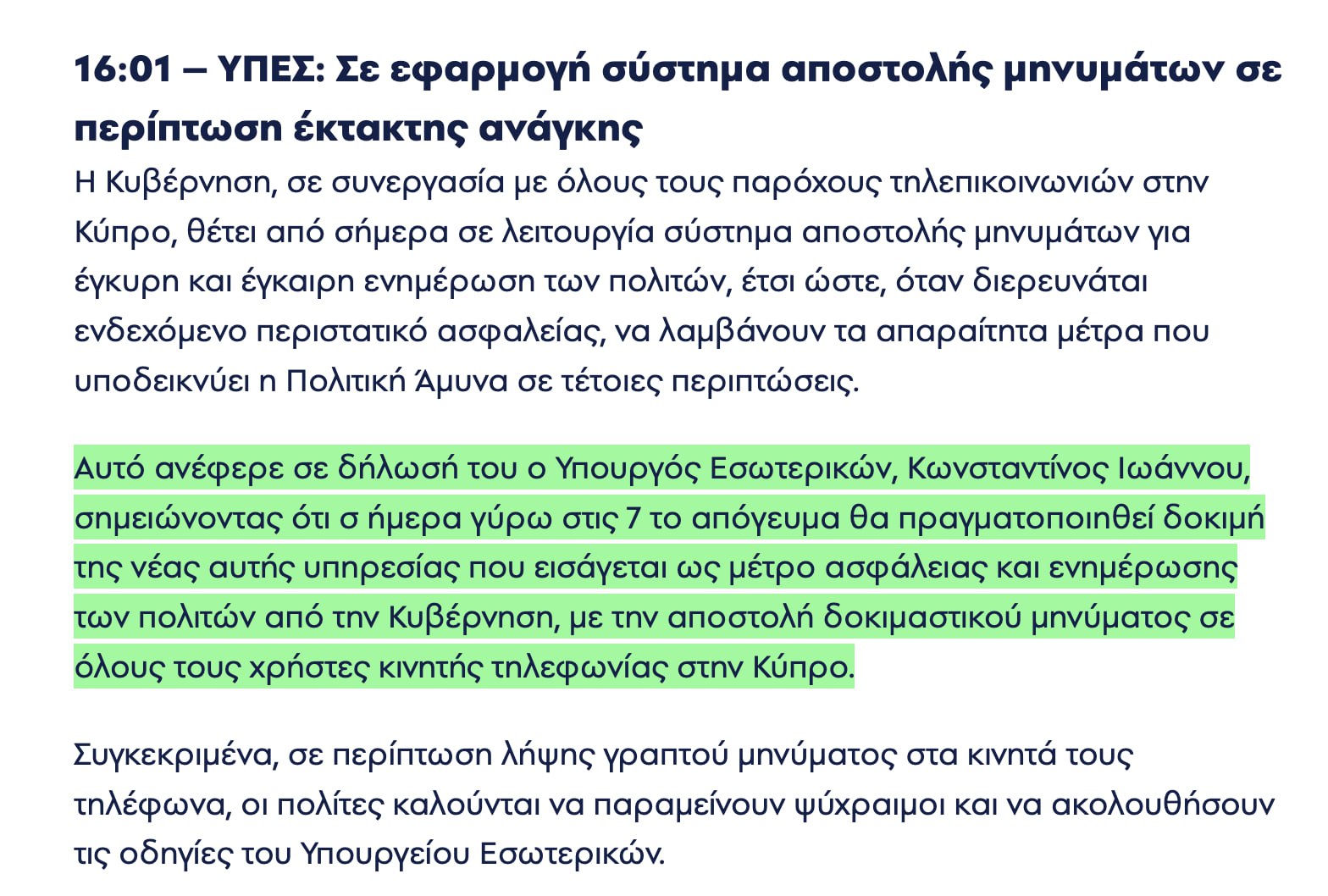 @olegcyprusМинистерство внутренних дел сообщает, что первое текстовое сообщение с превентивными мерами самозащиты было успешно отправлено на мобильные телефоны граждан.
