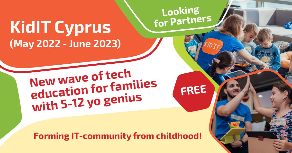KidIT - это новый формат технологического образования для детей 5-12 лет, трансформирующий детей из пассивных потребителей технологий в активных творцов, через создание своих собственных продуктов. Бесплатные занятия по 4 городам (Лимассол, Пафос, Никоссия, Ларнака) для 500 семей. Родительский нетворкинг-клуб для мягкой интеграции на остров. Презентации и участие детей в крупнейших IT-конференциях. Рабочие места.