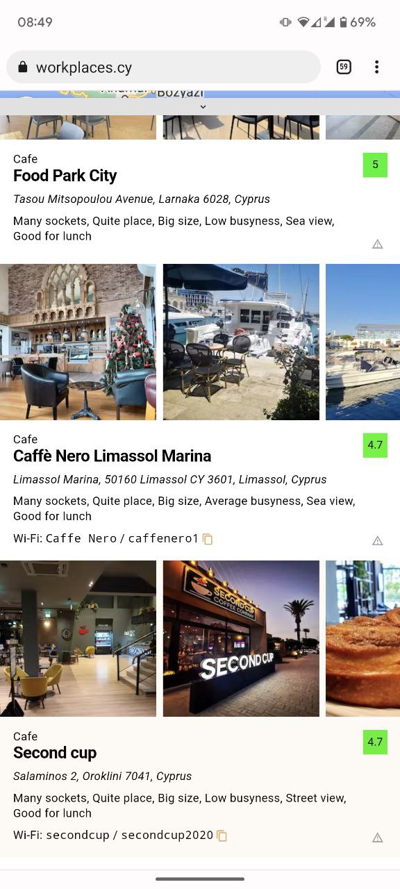 Небольшое, но очень полезное обновление https://workplaces.cy : добавлены Wi-Fi пароли в большинстве известных заведений. Теперь не придется искать пароль для подключения на чеке или стене 😎