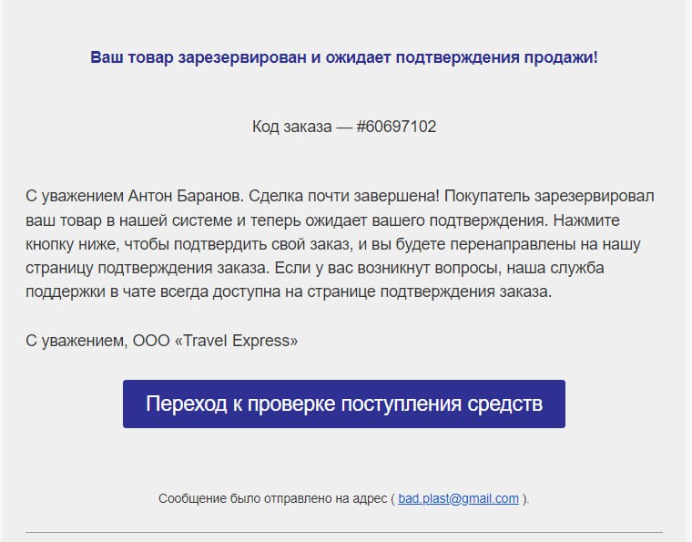привет! не продавал до этого на базараки ничего, написал некто с Пафоса, хочет купить товар. говорит закажет курьера на Travel Express, оплатит всё. попросил мэйл, мне пришло сообщение, которое было в спаме. ниже скрины. фишинг, развод?