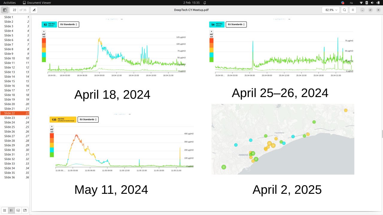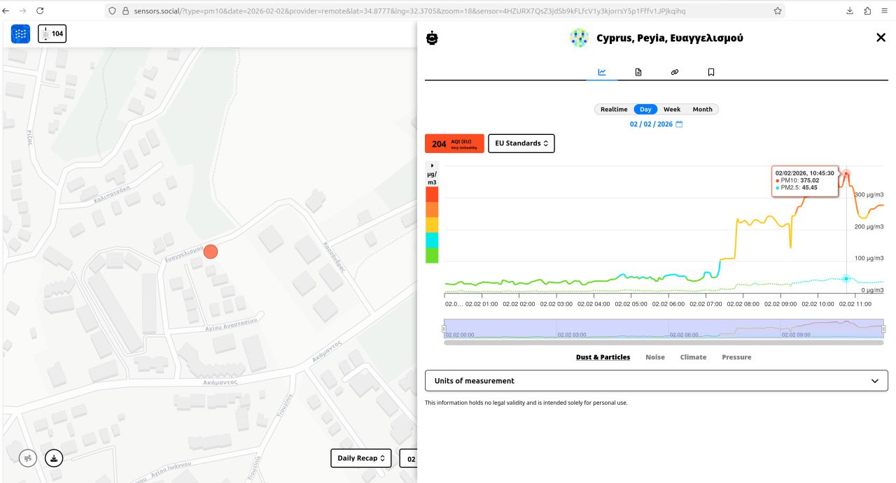 Так как это IT chat думаю будем многим интересно понаблюдать за природным явлением под носом через open source сенсорную сеть, что мы тут раскинули командой 2 года назад 🤓 и публикуем открыто данные от независимых участников с их балконов: https://sensors.social/?type=pm10&date=2026-02-02&provider=remote&lat=34.7961&lng=32.9153&zoom=11