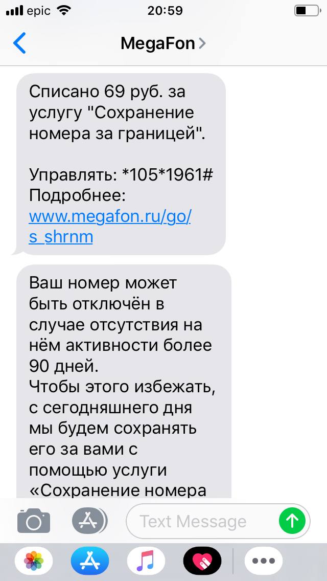 Я 26го сентября уехал из рф, вчера мегафон мне прислал СМС, что мне подключена услуга сохранения номера за границей за 69р/мес и списали 69р. Я думал, что раз в месяц если буду пополнять на 10р и слать какую-нибудь смску, будет норм, а они вот что творят