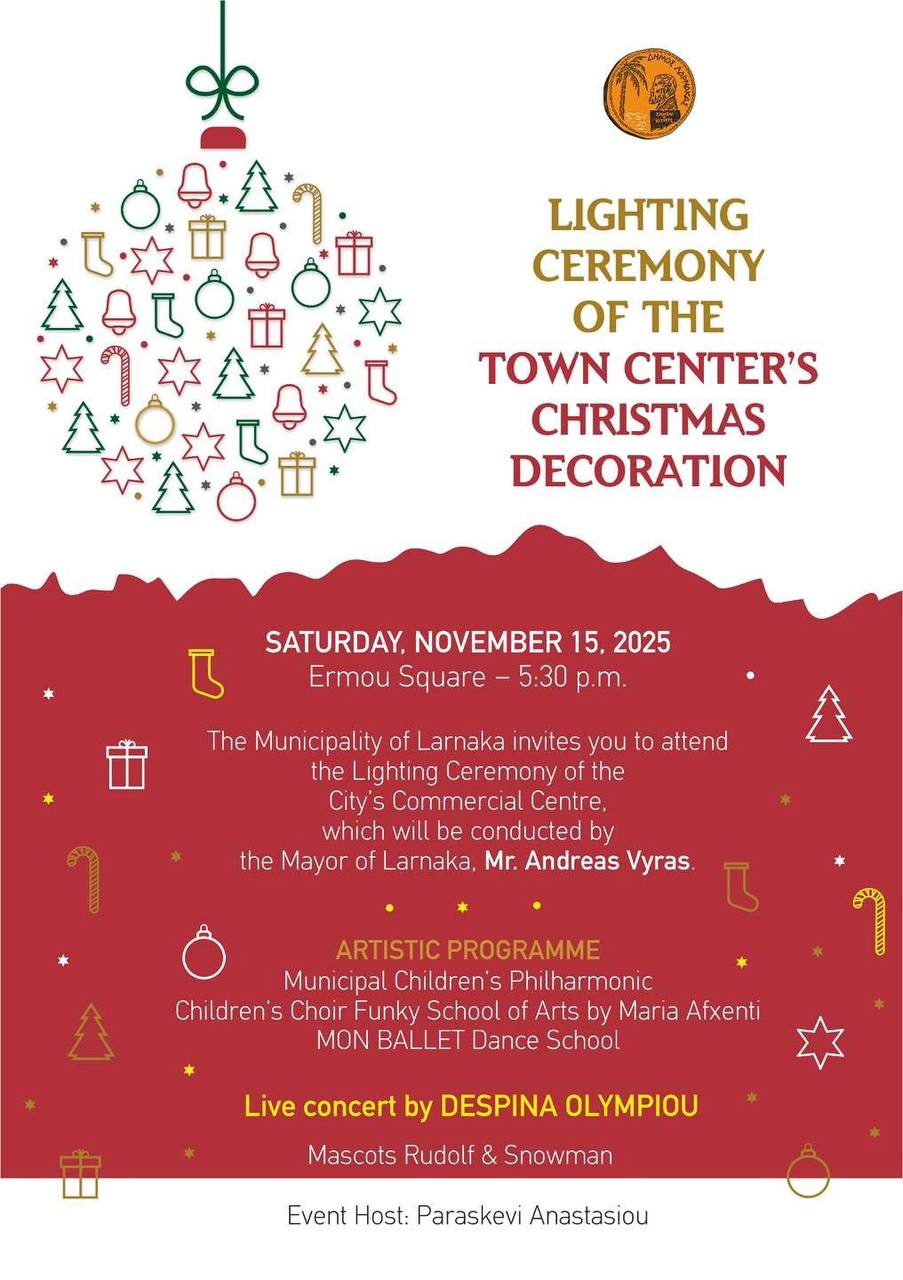 Муниципалитет приглашает всех — и взрослых, и детей — на церемонию зажжения огней в торговом центре, которую проведет мэр Ларнаки Андреас Вирас.