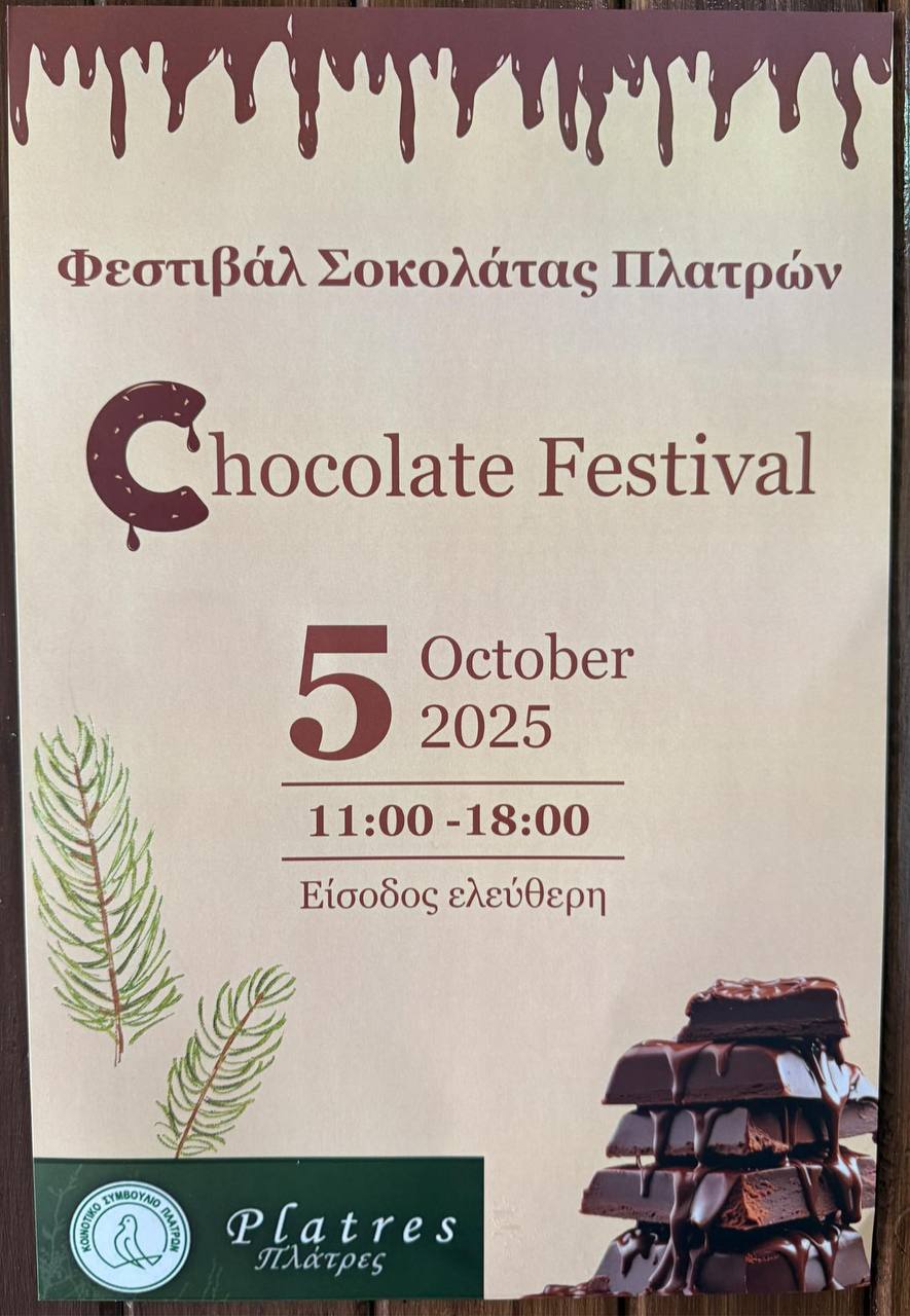 Платрес, знаменитая деревня в горах Лимассола, известная своей красивой природой, великолепными тропами и водопадами, приглашает нас на сладкий праздник, полный шоколада, музыки, игр и творческих мероприятий для детей и взрослых.