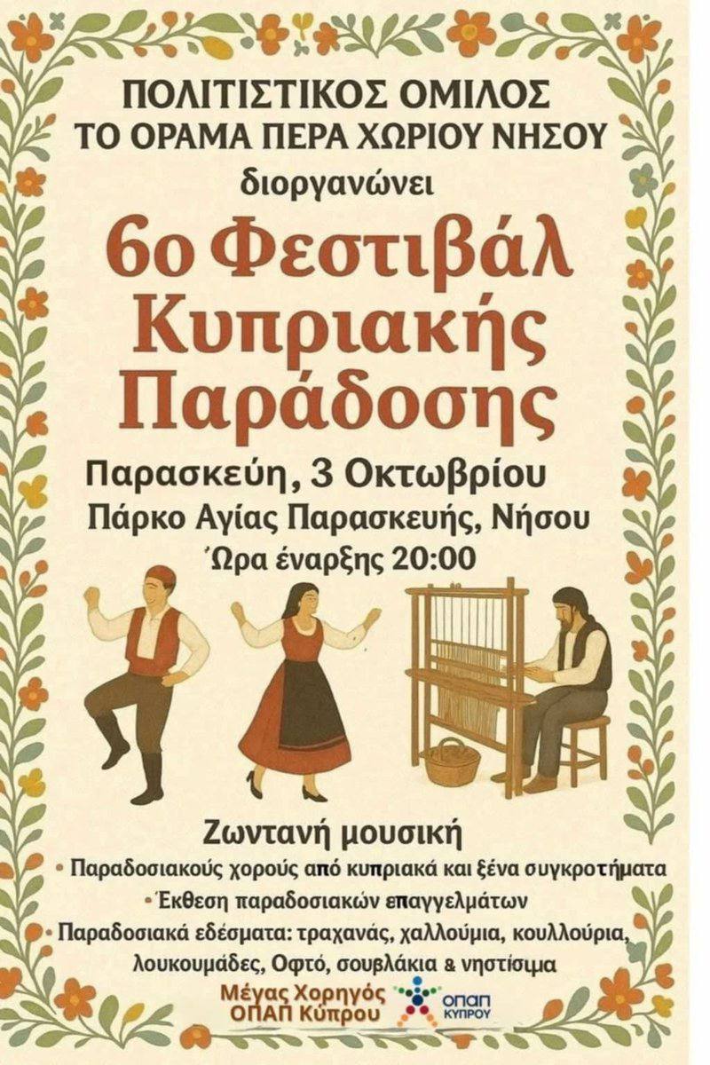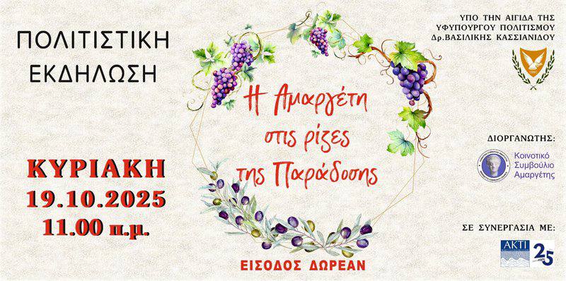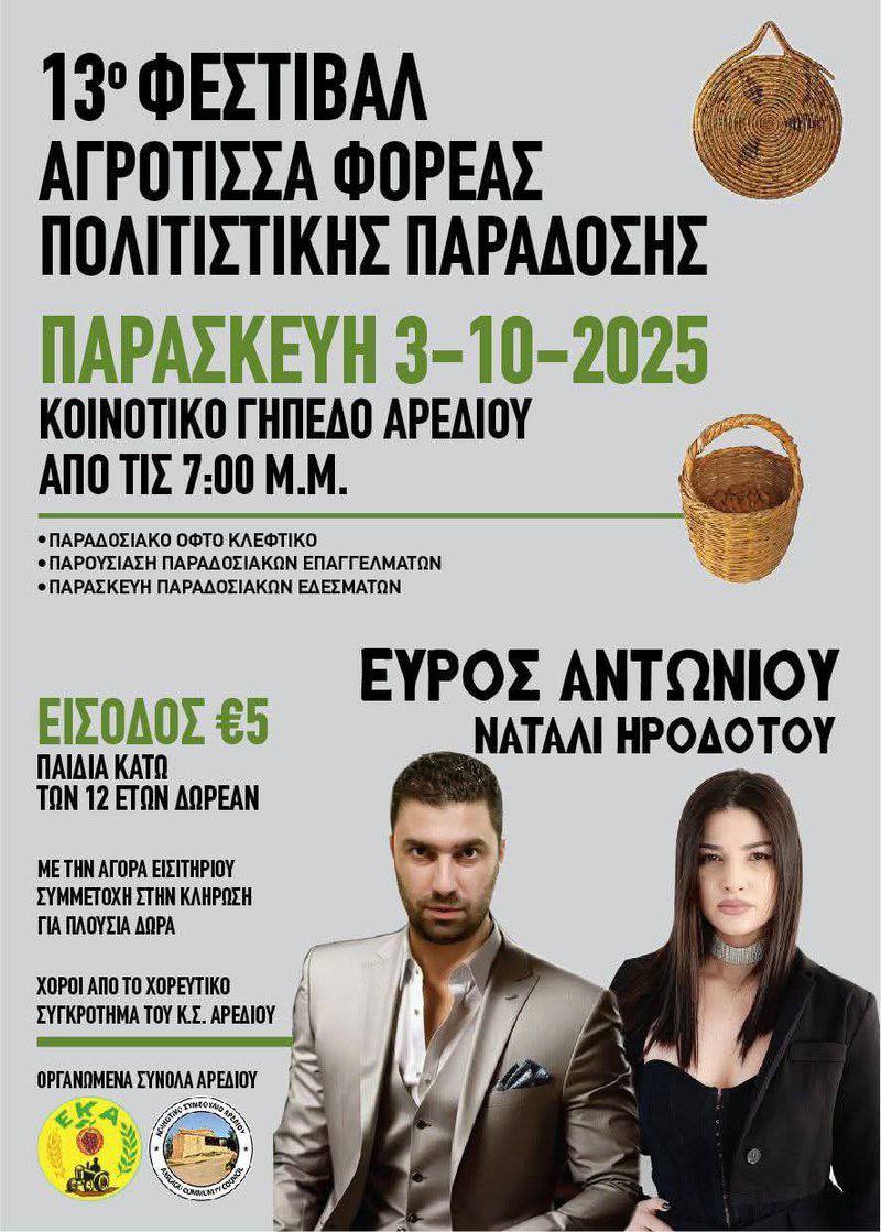 Деревня Аредиу в районе Никосии приглашает на большое праздничное собрание, посвященное женщинам сельской местности, крестьянкам – символу силы, творчества и традиций. Вечер будет наполнен красками, ароматами и теплом, с целью подчеркнуть работу и вклад крестьянки в общество, семью и культуру.