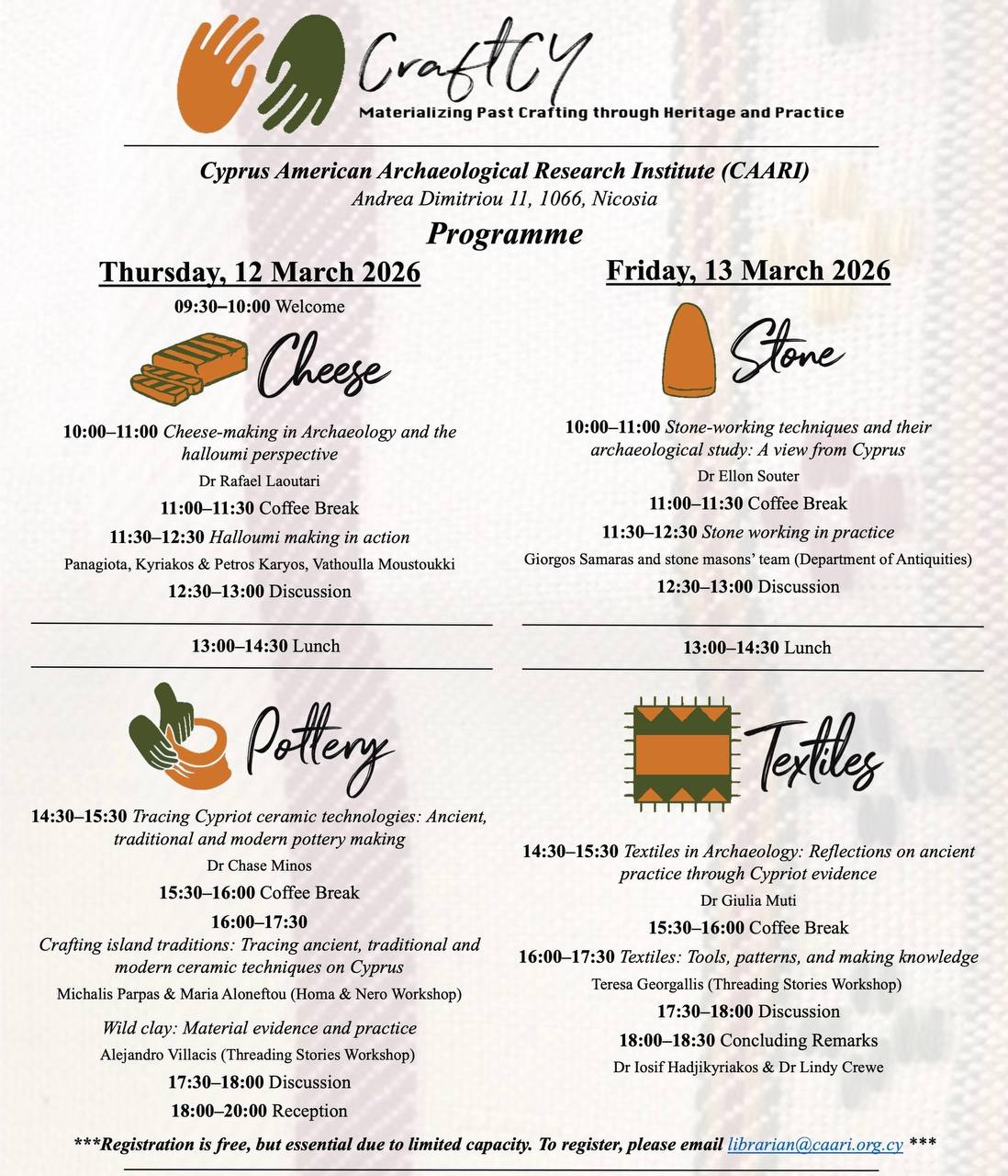 Каждый раздел начнется с лекции, посвященной археологическим свидетельствам каждого ремесла, за которой последует живая демонстрация мастеров и дискуссия. Это бесплатное мероприятие, но из-за ограниченного количества мест необходима регистрация: librarian@caari.org.cy
