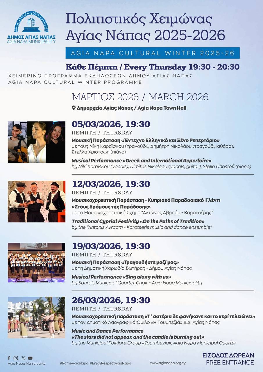 Все мероприятия начинаются в 19:30 в зале мероприятий мэрии Айя-Напы, вход для публики бесплатный