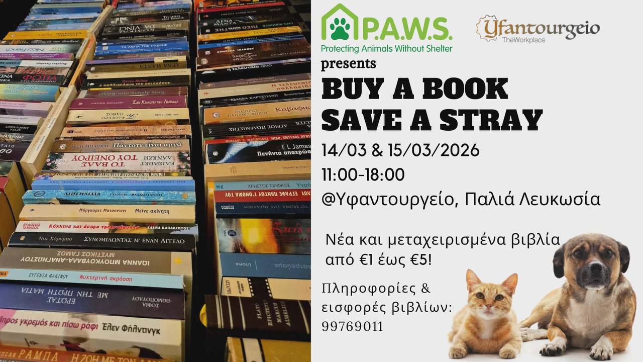 P.A.W.S. (Protecting Animals Without Shelter) в сотрудничестве с книжным клубом Yfantourgeio организует книжный базар в субботу 14 марта и воскресенье 15 марта с 11:00 до 18:00.
