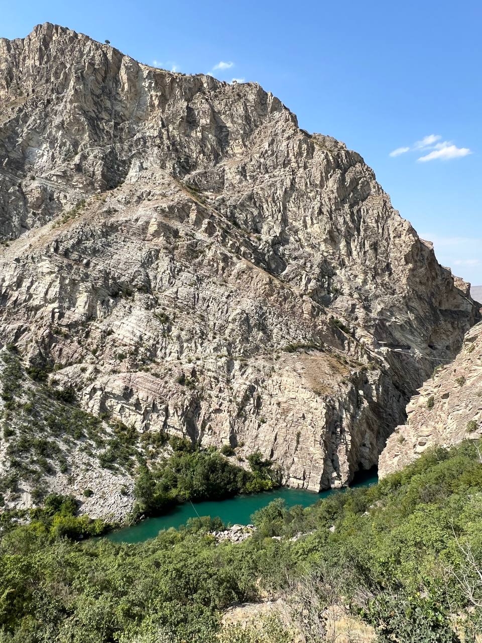 Переправляли нас на другой берег не просто так, а чтобы посмотреть красивое, но короткое ущелье, которое становится длиннее, когда водохранилище еще больше заполняется водой и она поднимается выше уровня природных перемычек, которые сейчас преграждают путь. Стены этого ущелья до боли напомнили родные островные пенаты, с поправкой на то, что в наших аналогичных ущельях летом воды фактически нет, однако геология ну очень похожа.