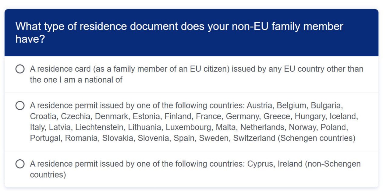 На самом деле ответ лежит на поверхности. На официальном сайте ЕС есть исчерпывающая информация и даже небольшая интерактивная анкета, которая поможет определиться, что нужно ближайшему родственнику из 3-й страны, чтобы поехать в Европу вместе с ЕС гражданином.
