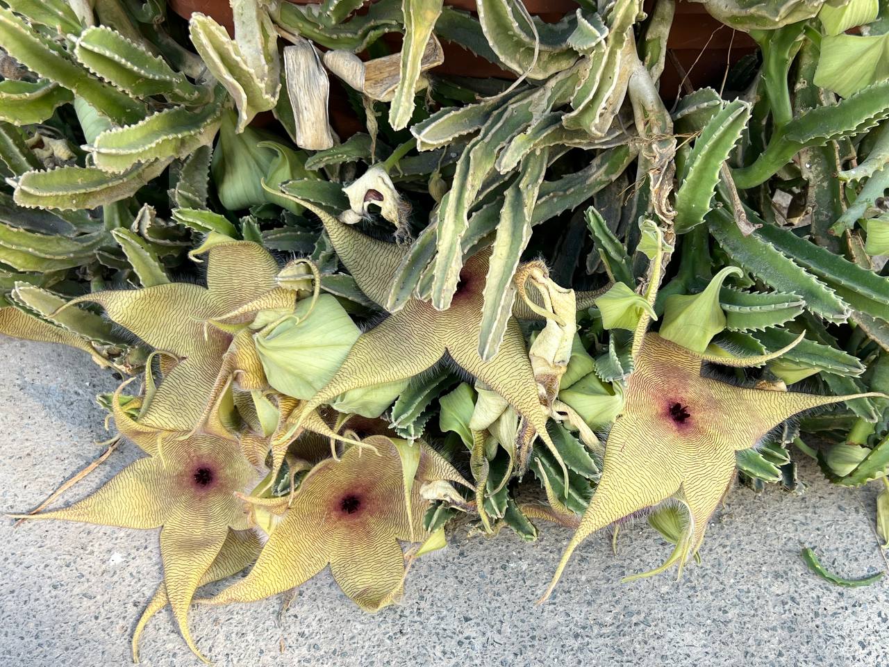 Этот инопланетный представитель — стапелия гигантская. Её геометрически правильные цветы, похожие на морские звёзды, покрыты ворсинками, которые вместе с естественной толщиной лепестков создают ощущение объёмности. Когда я первый раз проходила мимо, сослепу не разглядела и подумала, что кто-то выкинул морских гадов, не успевших дожить до кастрюли. Они и правда похожи на каких-то живых существ, кажется, стоит подойти поближе, а они зашевелятся и начнут отползать.