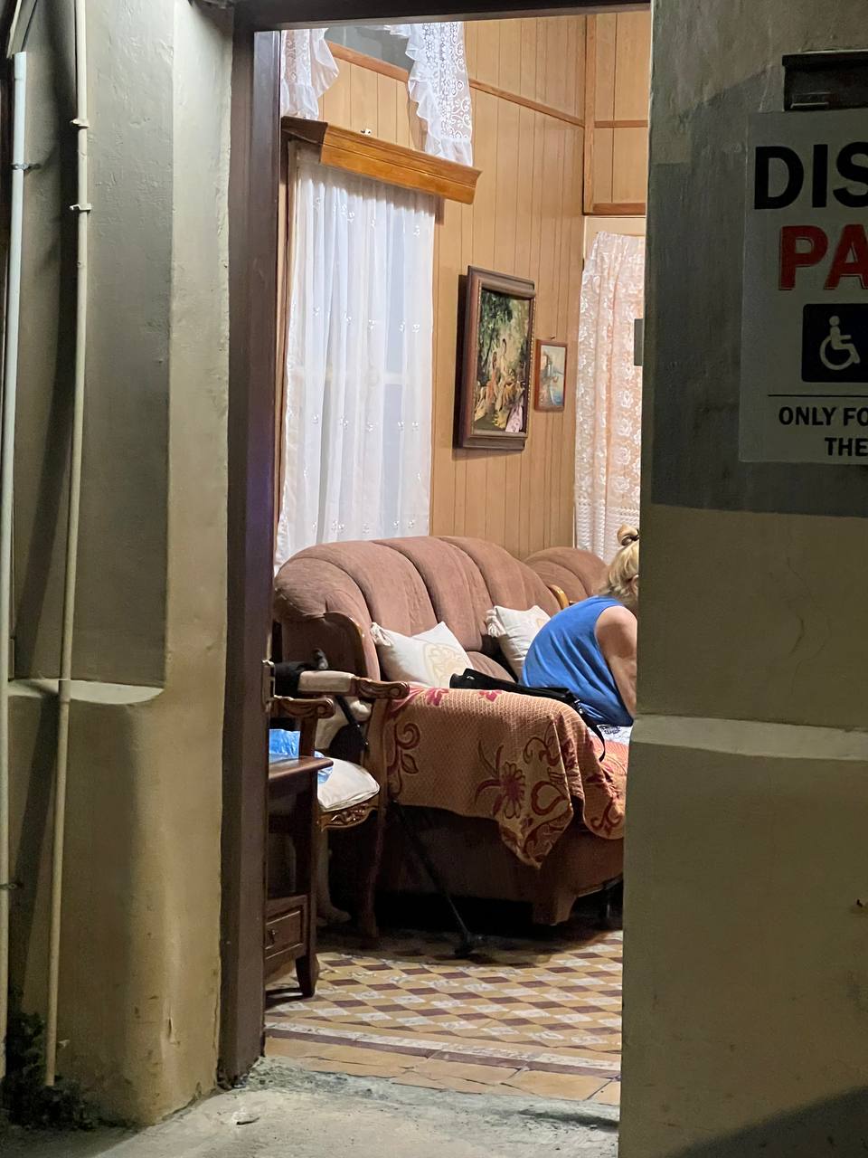 Вот, например, типичный кипрский дом. Дверь открыта настежь, прямо с улицы утыкаешься диван, как продолжение тротуара. На диване сидит женщина, рядом журнальный столик, напротив — мужчина в кресле, на стене светится телевизор. Всё это — сцена повседневности, видимая каждому прохожему.