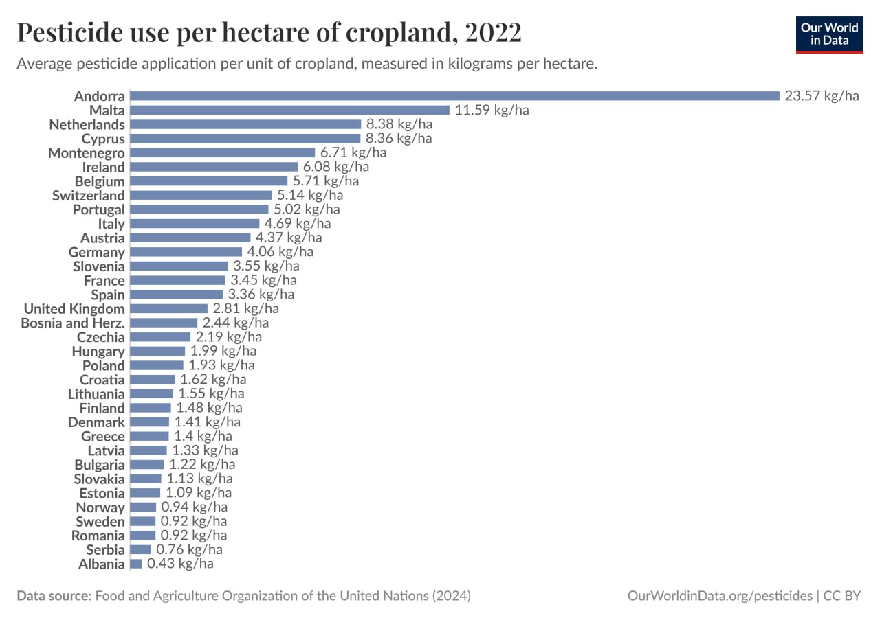 Да, показатели Андорры удивили даже меня — но где в горах найти плодородные пахотные земли, и, возможно, обилие местных насекомых превышает количество посевов? 🤷♀️ С Мальтой всё тоже понятно: остров-камень посреди моря, как и с Нидерландами — королевством гидропоники и пластик-фантастик.