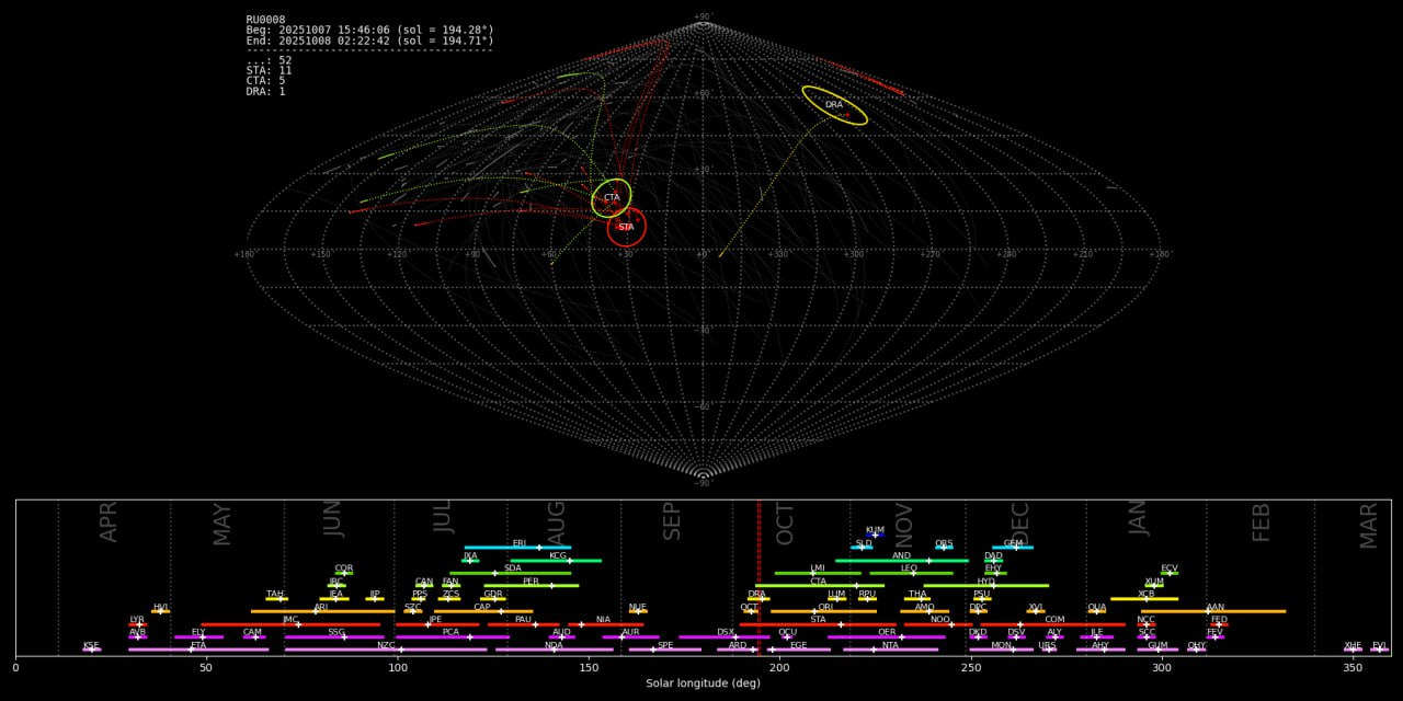 📈Прошедшей ночью (7/8 октября) наши 5 метеорных камер сети GMN установленные на астроферме "Астроверты" (Архыз, С.Кавказ) за целую ясную ночь (11 часов съемки) поймали всего 6 метеоров из потока Дракониды. Таким образом ZHR составил менее "1". Это ожидаемый уровень активности за сутки до максимума активности.
