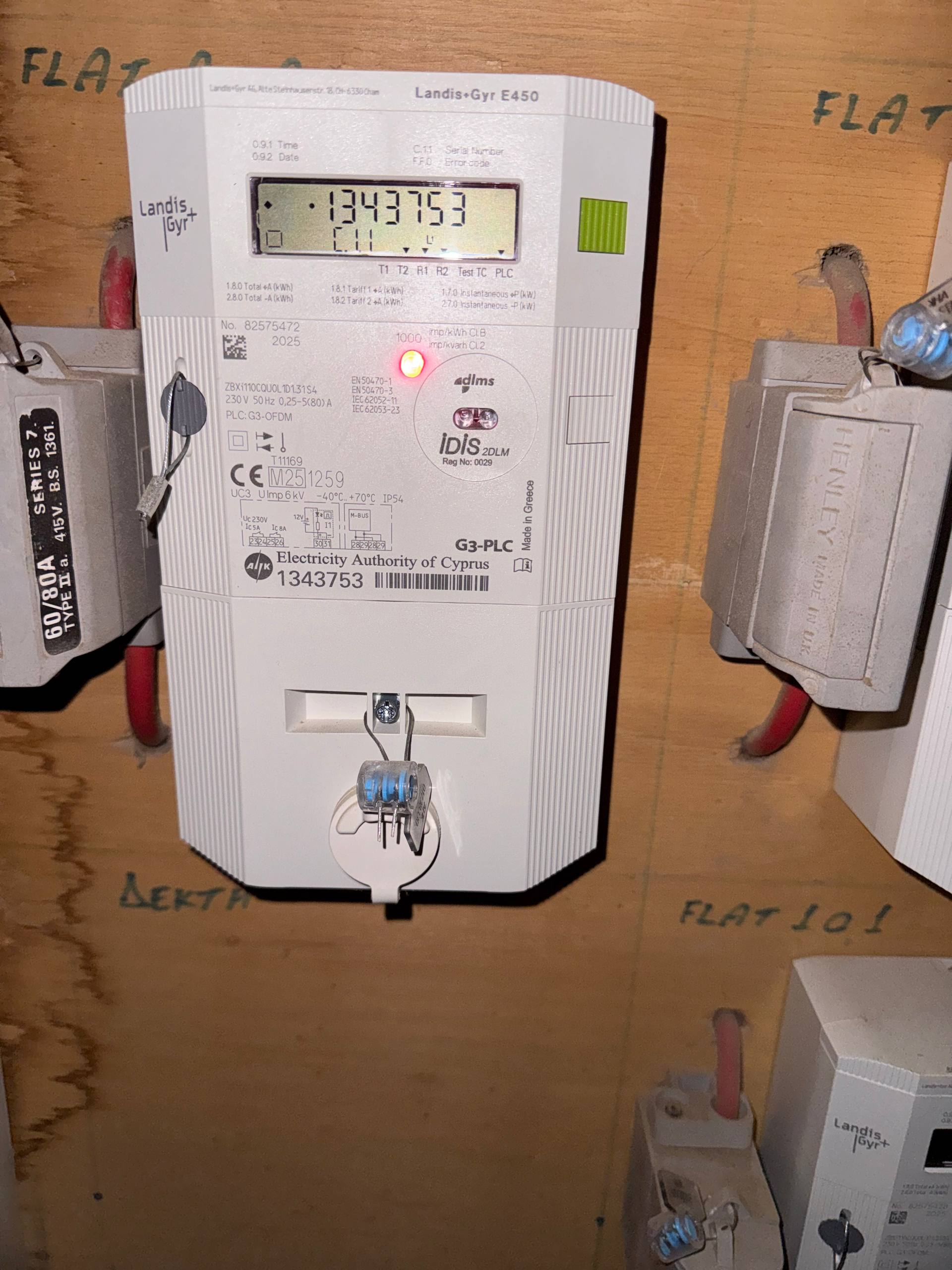 @Nick_VolynkinПохоже, было короткое замыкание, но предохранители в квартире не сработали, зато сработало что-то снаружи. Теперь вся квартира обесточена. Внизу счётчик выглядит вот так, на нём горит красная лампочка, на других не горит.
