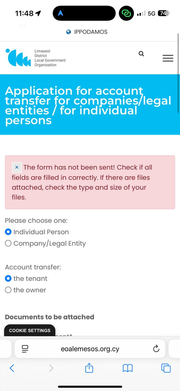 Владелец прислал форму с сайта департамента водоснабжения https://eoalemesos.org.cy/en/account-transfer но каждый раз когда ее заполняю, выдает ошибку без указания причины