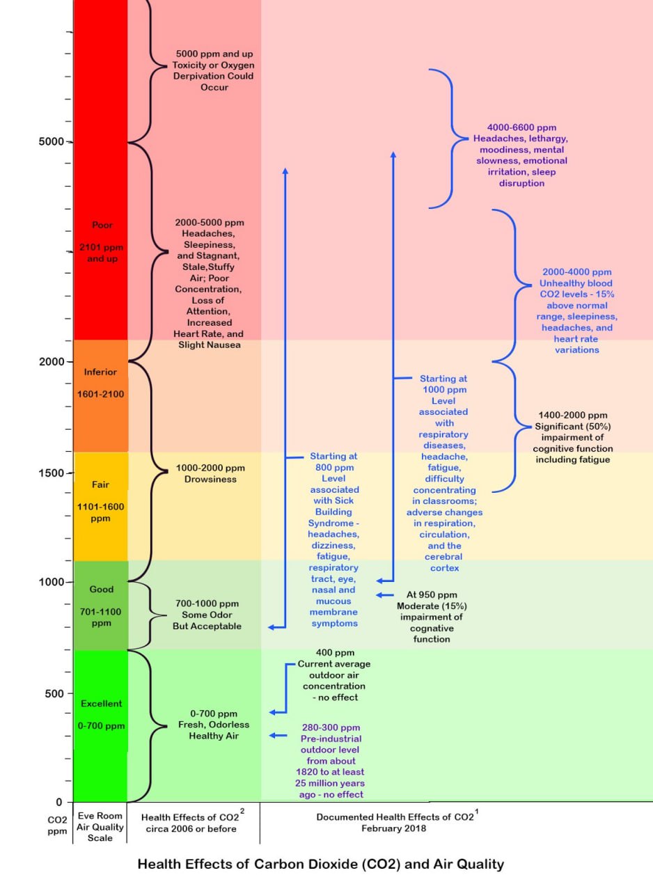 а вот что пишут по этому поводу ученые а не маркетологи: It should be noted that CO2 is not generally considered as a health hazard at the concentrations that typically occur in nonindustrial indoor environments. Exposure limits for CO2 established by agencies associated with safety and healthy working conditions, e.g. National Institute for Occupational Safety and Health (NIOSH) from USA, are 5000 ppm for time weighted average (average exposure on the basis of an 8-hour day and a 40-hour workweek) and 30 000 ppm for short-term exposure limit (time weighted average exposure that should not be exceeded at any time during a workday) [9]. Similar threshold values are provided by European regulations (e.g. [10]. Adverse health effects have not been observed below the level of 7000-10000 ppm during prolonged exposure to CO2 and below 20 000-30 000 ppm by short-term exposure [5], [11], [12], [13]. Some investigations showed an association between elevated indoor CO2 levels (1000-4000 ppm) and increases in SBS symptoms. Nevertheless, no direct link between exposure to CO2 and SBS symptoms was found – only the correlation with other indoor pollutants that may cause adverse effects was suggested https://www.sciencedirect.com/science/article/pii/S1877705813007558