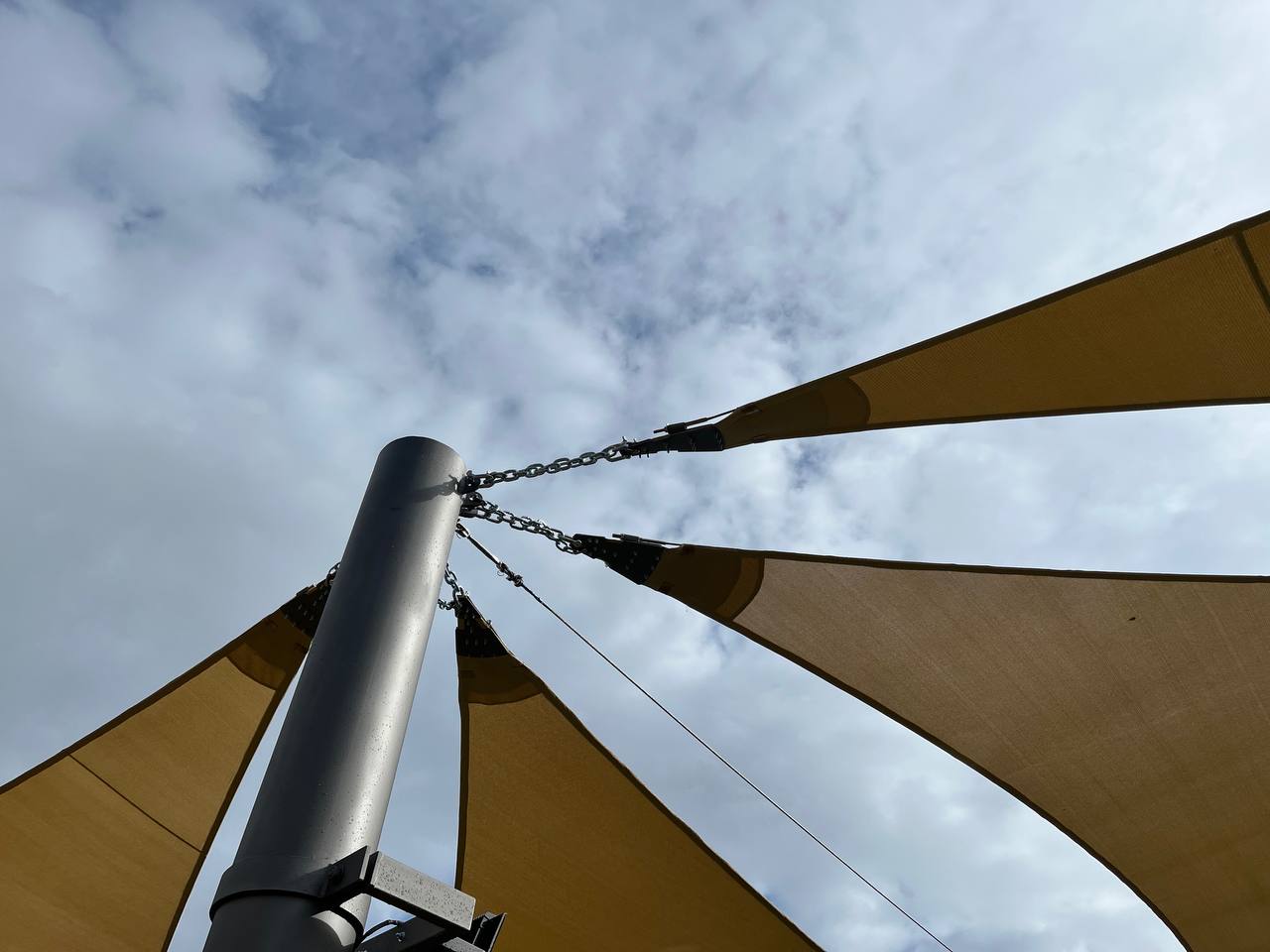 И не мудрите с пружинами которые предназначены для швартовых ( где другая среда ) . Архитектурные паруса натягиваются и выбиваются до звона . А пружинка любая рано или поздно прилетит в башку ))) в этом кстати минус большой , у нас на детской площадке сорвало одно полотнище с крепления, полоскало 2 дня пока ветер не стих . И методично лупила стальным коушем и цепью по чему могла достать .