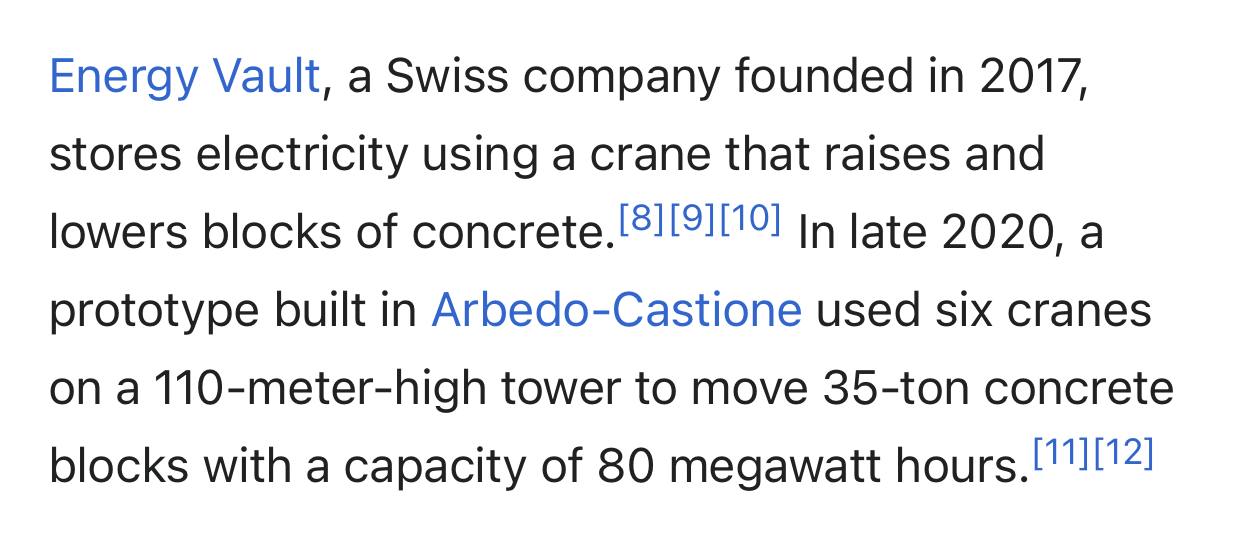@stepanseliukЕсли выкопать цилиндр/куб яму, скажем метров на 18, плюс два метра будет на поверхности, забетонировать и разделить высоту пополам, на два резервуара, верхний с нижним соединить короткой трубой в которой турбина-генератор, а нижний с верхним длинной трубой с помпой. Да интересно каков объём воды нужен, для ёмкости 100-200квт часов )) и главное его можно зимой с участка насобирать, потенциально