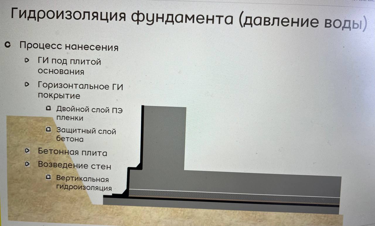 А зачем снизу? Раньше на фундамент укладывали рубероид, потом стали мазать аналогичным составом, сейчас в целом поменялся состав ну и бывает в бетон добавляют спец добавки. Задача гидроизоляции - не дать влаге уйти в стены от фундамента