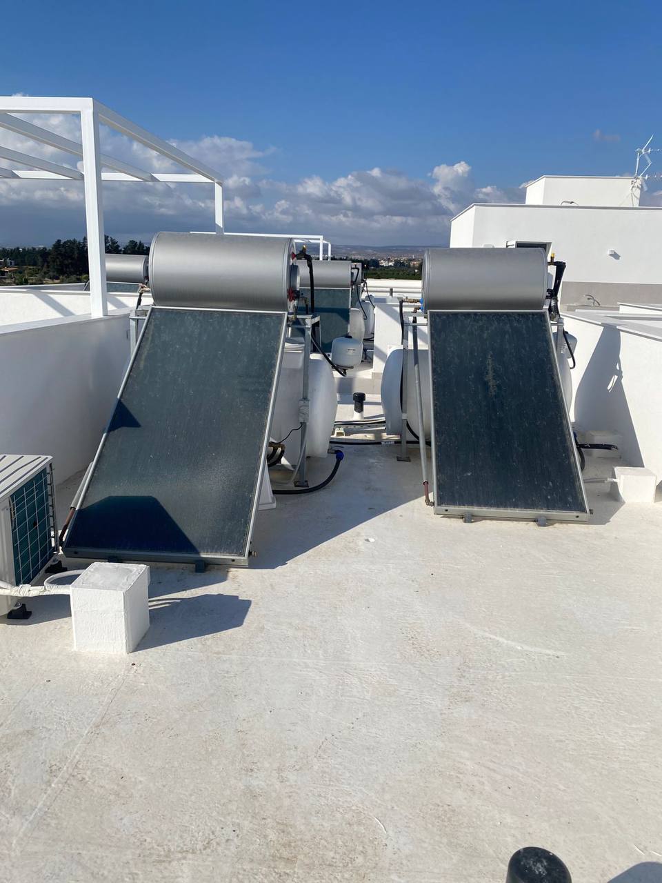 Панелька вот эта на солнечную похожая - солнцегрейка. А водогрей (кипятильник) внутри бака серого