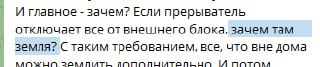 И главное - зачем? Если прерыватель отключает все от внешнего блока, зачем там земля? С таким требованием, все, что вне дома можно землить дополнительно. И потом дополнительно землить дополнительную землю - мало ли что.....