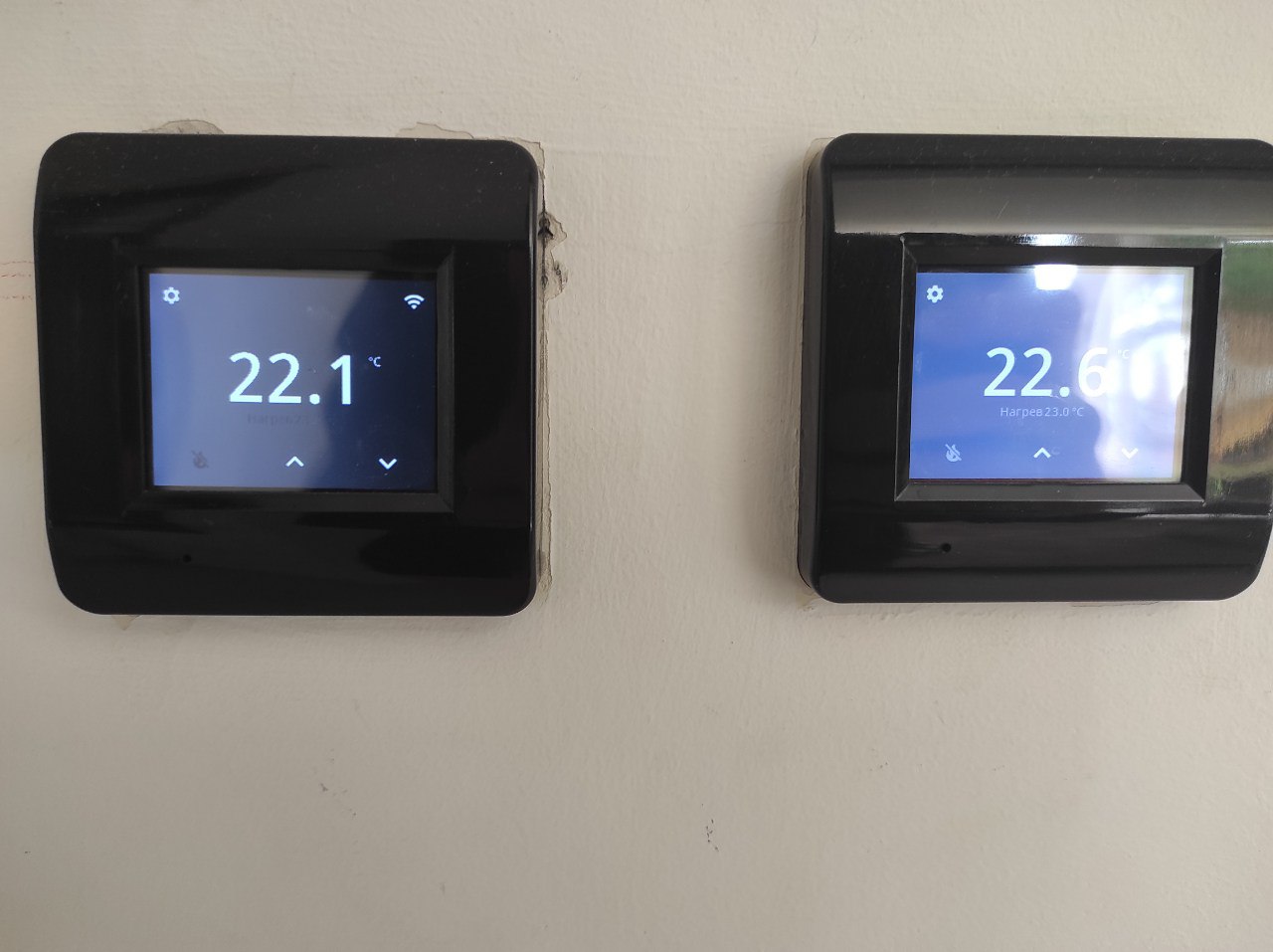 Слева наружная коробка с wifi реле shelly (под включение нагрева горячей воды от дизеля)