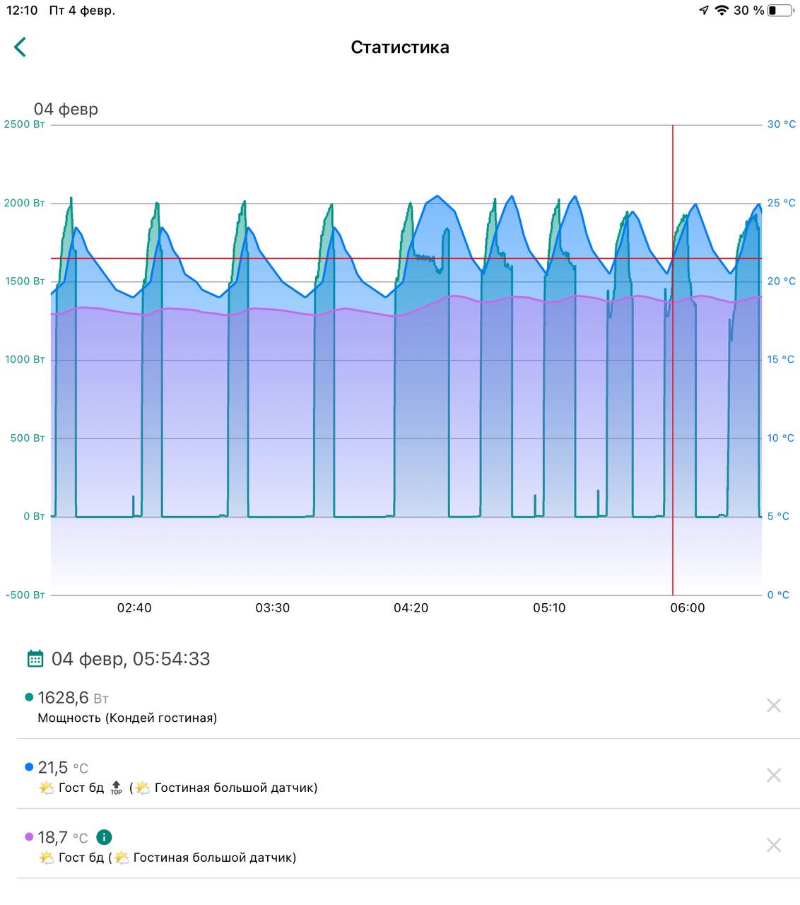 Под утро, сценарий управления кондеем предусматривает с 4 утра температуру не меньше 19,7 градуса по датчику 0,7м от пола. Так комфортнее утром 🙂