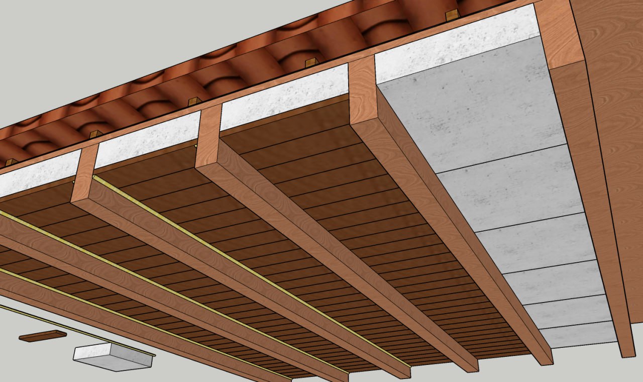 Уважаемые рукожопы, нужен совет: есть деревянный скатный потолок. Планируется его утепление изнутри с воссозданием структуры, т.е. поверх дерева между балками закладывается утеплитель, затем снова лицевое дерево (как на рендере). Есть ли какие-то варианты скрытого крепления лицевого дерева к балкам так, чтобы чистая эстетика и без уголка/плинтуса?