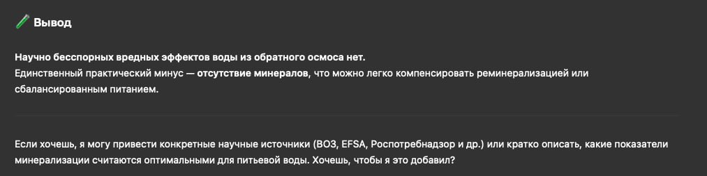 Вывод: В целом, пища является основным источником большинства минеральных веществ, но вода также важна, особенно для некоторых элементов (например, фтора, а также кальция и магния) и их биодоступности (усвояемости).