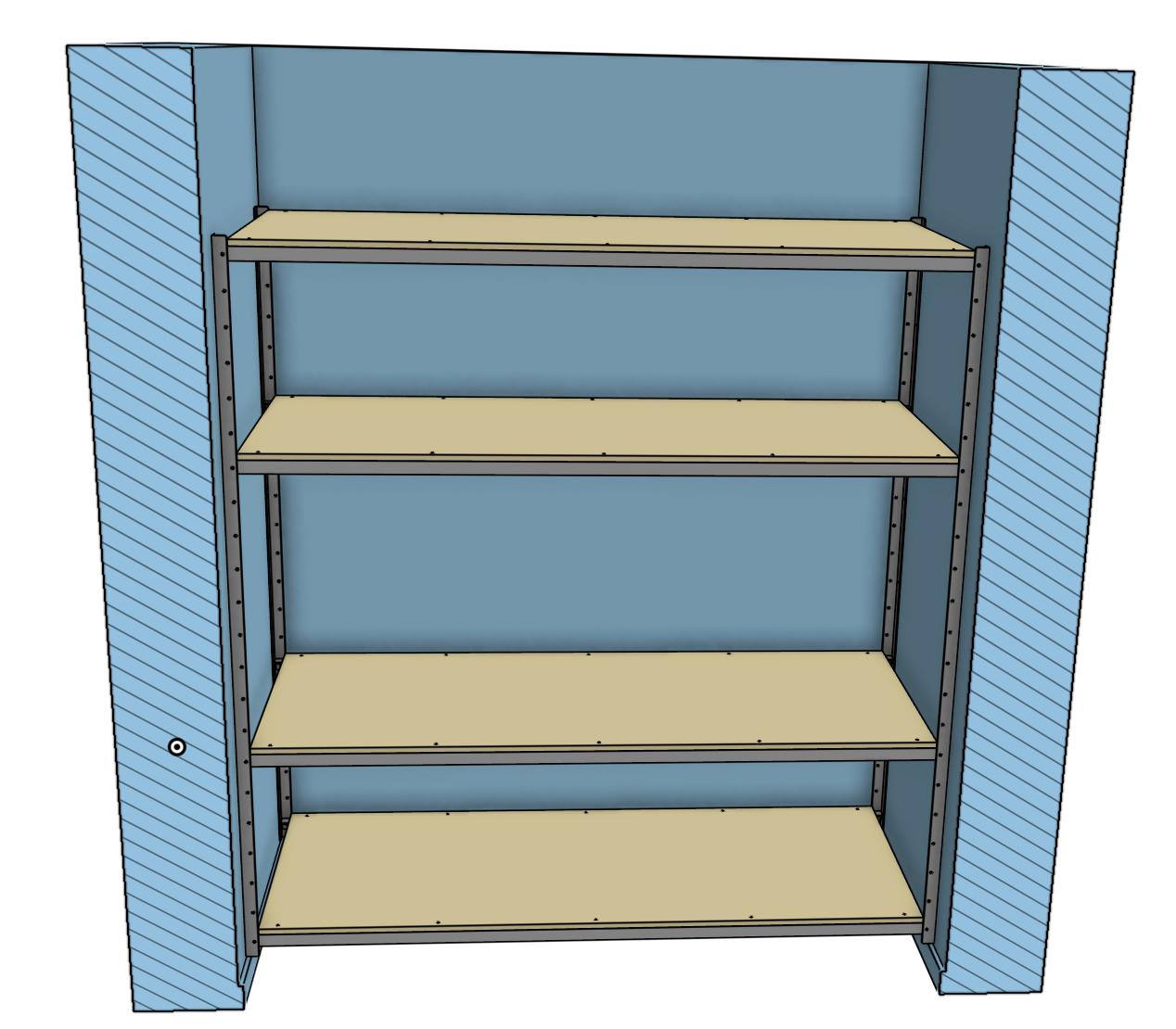 Вертикальные опоры прикрутить к боковым стенам. По ширине 215 сантиметров. С расчетом на нагрузку 200 килограмм на полку. Будут стоя ть 3d-принтеры, некоторые по 45 кг.