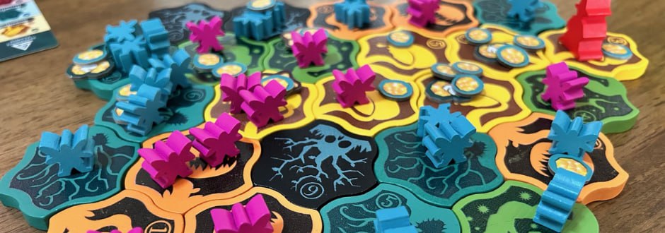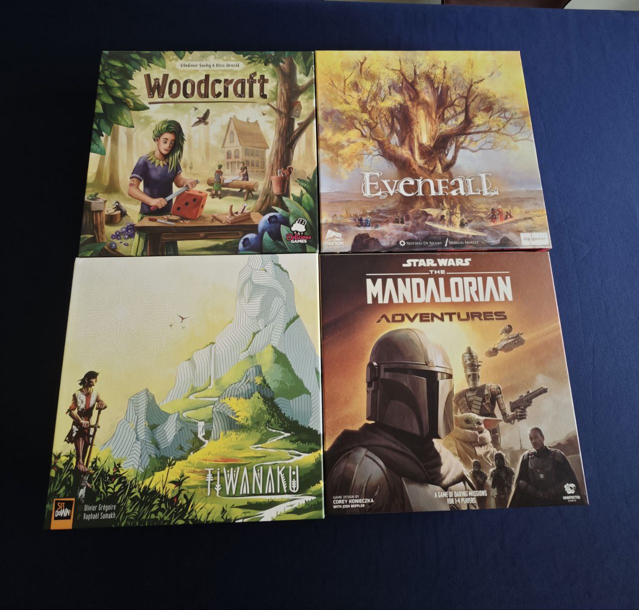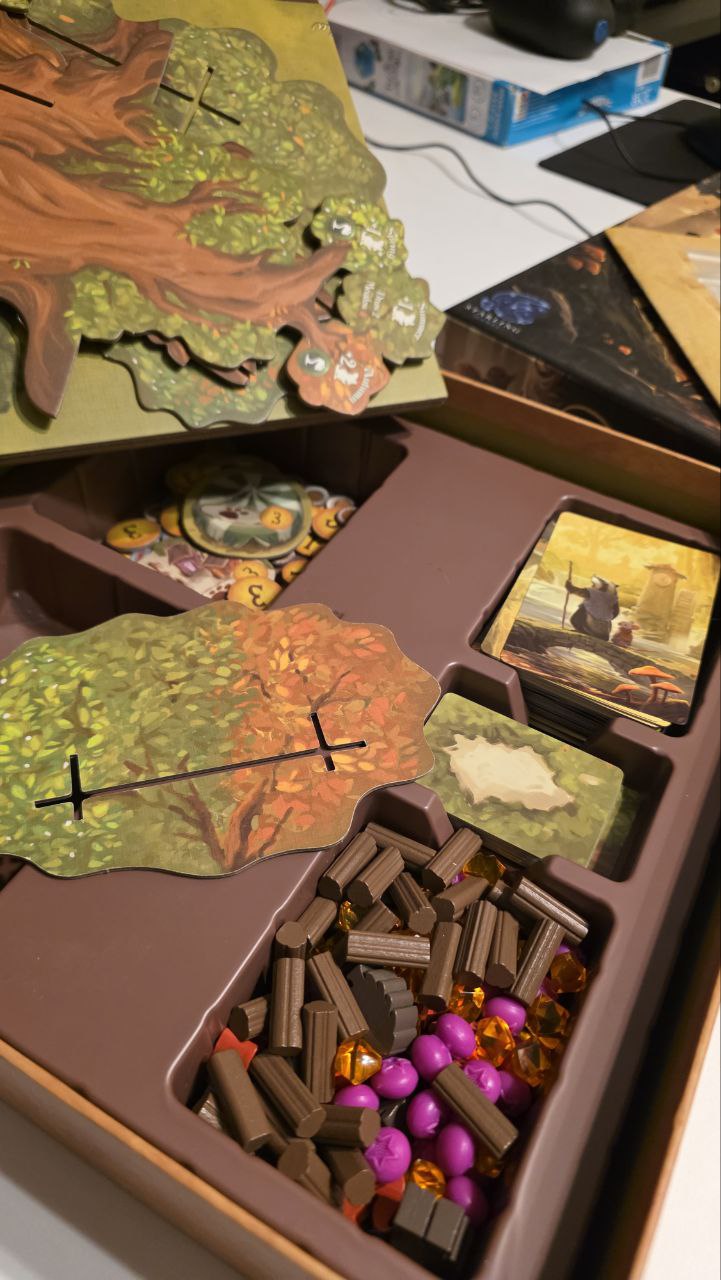 1.WOODCRAFT, для 1 - 4 игроков, игра языконезависимая, правила на английском языке. В комплекте идёт напечатанный органайзер на 3D принтере, что сильно облегчает сетап игры. Цена 35€.