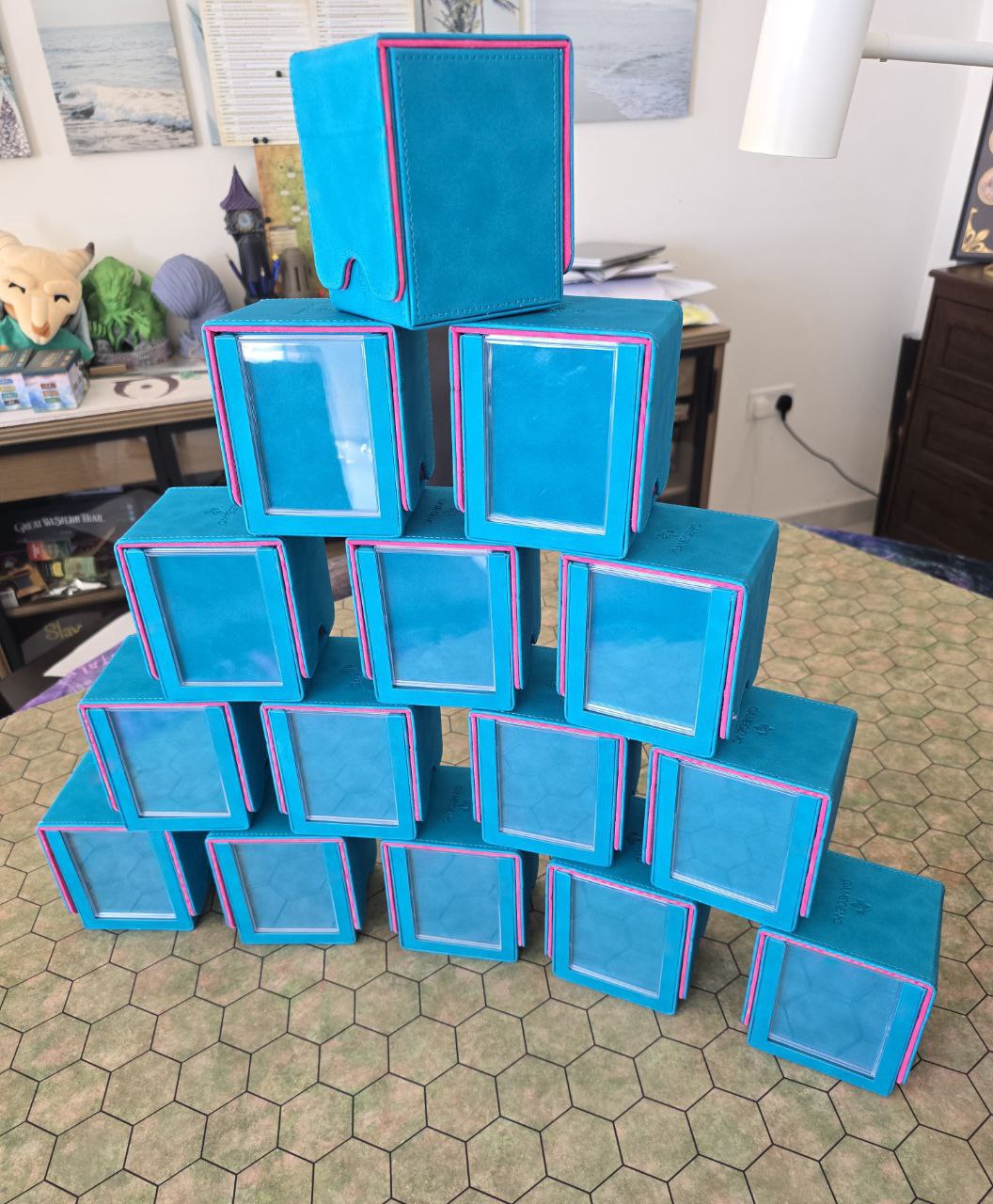 В каждую влезает по 100+ карт в двойных/тройных протекторах.