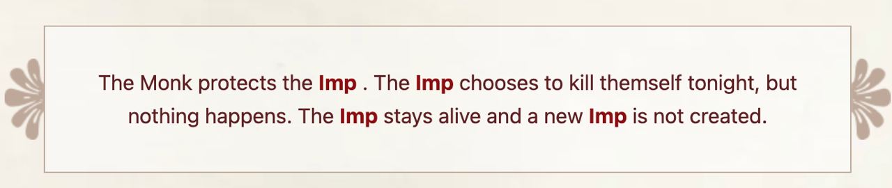 2) Я не думаю, что для миньона стать демоном это негативный эффект. Но вообще я склонен считать, что нет, защита монахом миньона не защищает того от становления демоном вместо самоубившегося импа. Это не очень соответсвует интенции роли и добавляет ей странные дополнительные сайд эффекты, уж простите мой програмистский сленг.