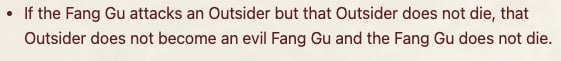 здесь я стараюсь руководствоваться только ролью фан-гу: Each night*, choose a player: they die. The 1st Outsider this kills becomes an evil Fang Gu & you die instead.