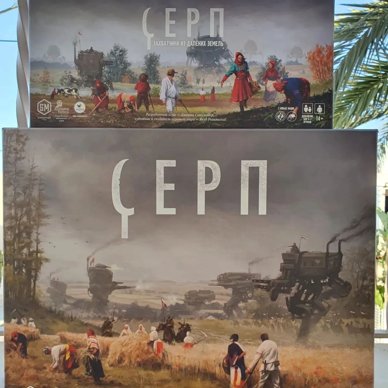 🎲"Серп" — стратегическая игра, в которой игроки выступают за различные фракции, которые сражаются за контроль над землями и ресурсами, используя механизированные единицы, специальные способности и стратегические решения. Цель игры — набрать наибольшее количество очков за определенное количество ходов производя ресурсы, захватывая территории и управляя ими. "Scythe" является очень популярной игрой среди любителей настольных игр и имеет множество наград и номинаций в индустрии настольных игр