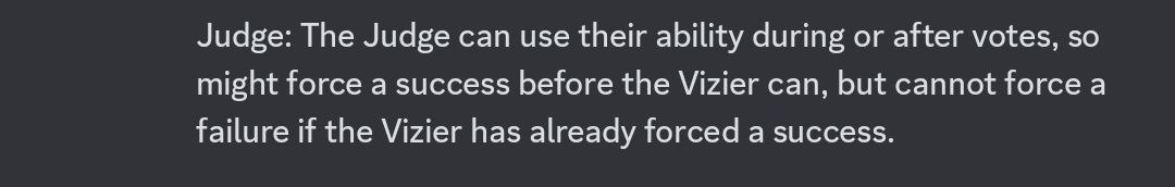 То есть, Судья не может спасти человека, если Визирь уже его решил казнить. Но Судья может быстро оправдать человека, пока Визирь не успел казнить.