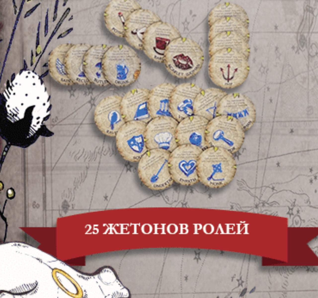 Исполнение тоже не подкачало — большая красивая коробка, жетоны со специальным покрытием для размещения внутри коробки, памятки ролей и прочее.