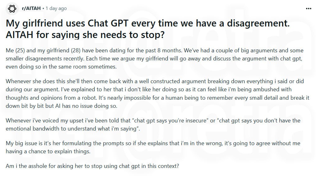 Еще и в личной жизни можно ИИ использовать. Вон девушка использует ChatGPT каждый раз, когда она ругается с парнем. И благодаря этому она побеждает в спорах.