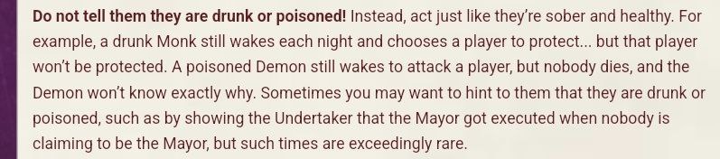 1. Я вытянул жетон демона - мои убийства не проходят, мои миньоны не признают меня, моими блефами представляются другие люди —> я лунатик