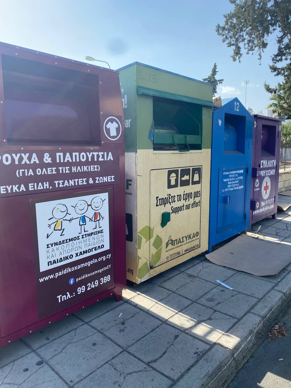 ANAKYKLOS TEXTILES LTD (сиреневые баки) была основана с основной целью защиты окружающей среды и специализируется на сборе ненужной одежды, обуви, сумок и ремней. Собранные предметы пересылаются и сортируются, и те, которые можно использовать повторно, получают второй шанс, а те материалы, которые нельзя использовать повторно, они перерабатывают через партнеров. Также у них есть бесплатная услуга вывоза одежды прямо от двери дома https://anakyklos.com/