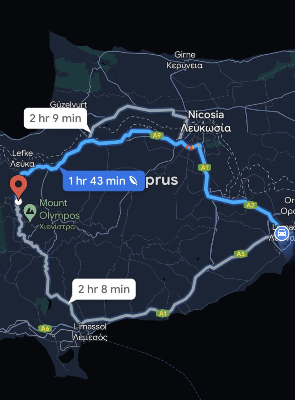 Подскажите пожалуйста, как навигатор выбирает маршрут, по этой дороге можно доехать или там граница. Или через Лимассол придется ехать?