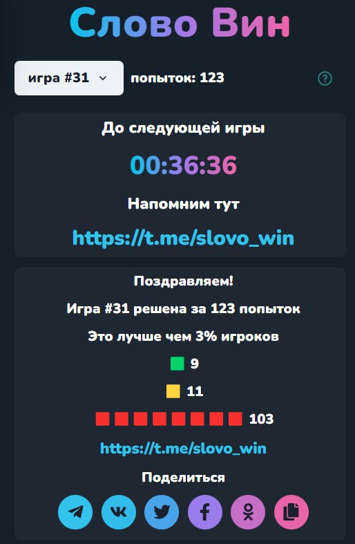 Уважаемые односельчане! Приглашаю потестировать залипательную игру в слова, которую я сделал: https://slovo.win. Буду благодарен за обратную связь