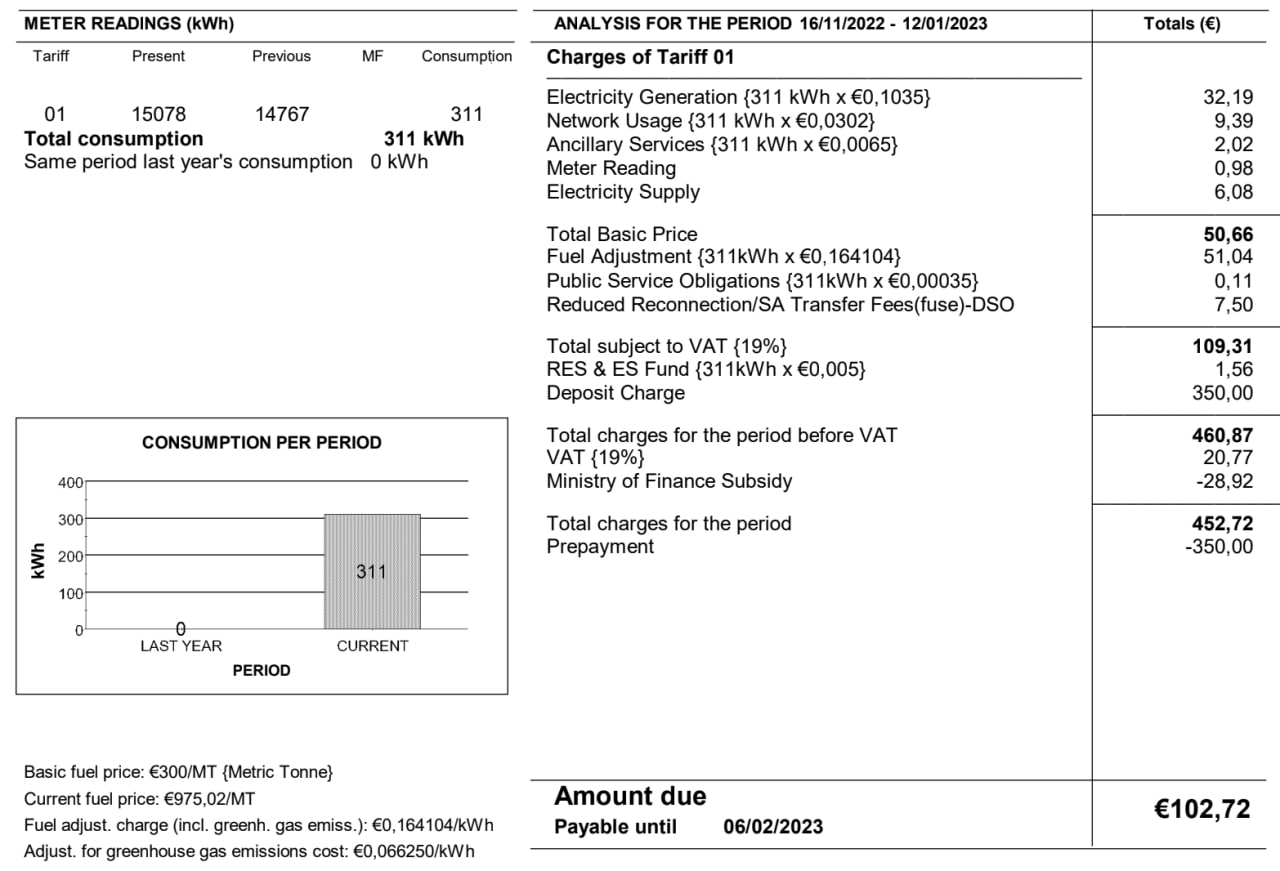 Всем привет. Помогите разобраться в калькуляциях, пожалуйста. Пришёл первый счет за электричество. При переводе электричества на меня уже вносился депозит 350евро. Здесь вижу Deposit charge в сумме 350, но потом на него сумма уменьшена (последняя строка в правом столбце). То есть потребовали внести депозит, но сразу уже зачли уже внесённую сумму.